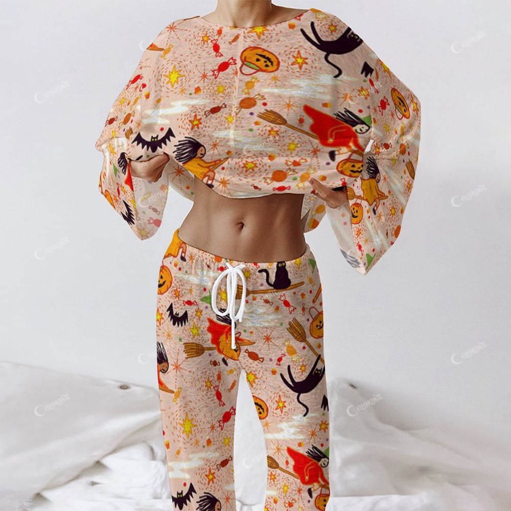Colordate Women's Halloween Graffiti Print Long Sleeve Homewear Set
