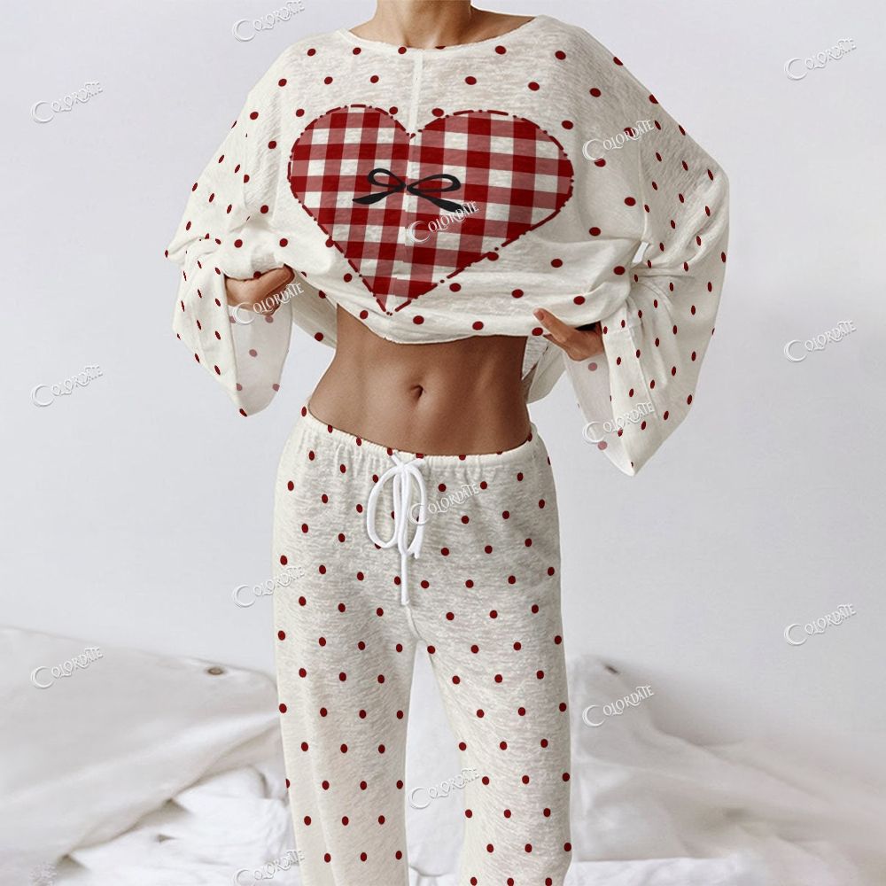 Colordate Women's Heart And Polka Dot Prints Long Sleeve Homewear Set