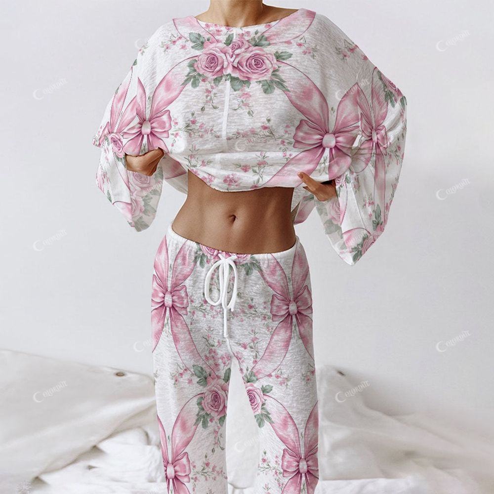 Colordate Women's Pink Flower And Bow Print Long Sleeve Cotton Homewear Set