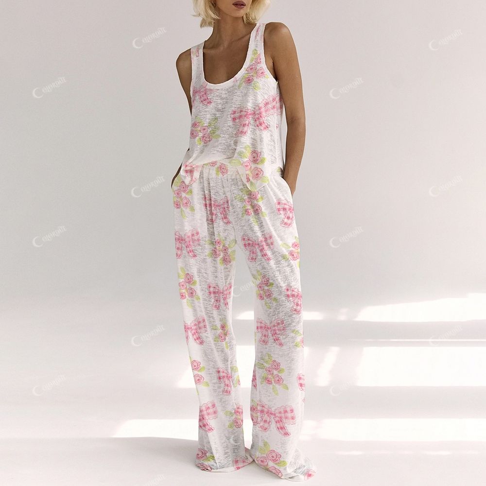 Colordate Women's Pink Plaid Bow With Floral Print Vest and Pants Set