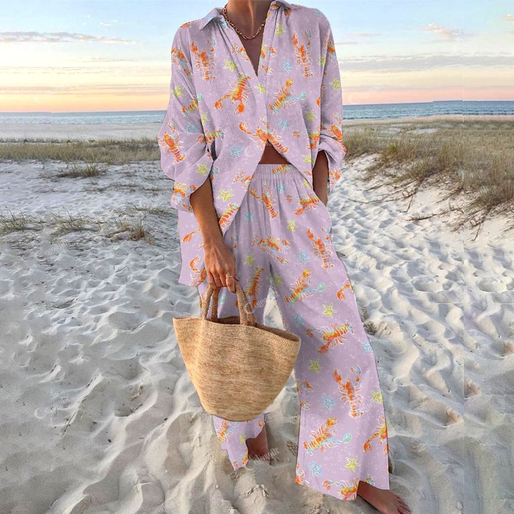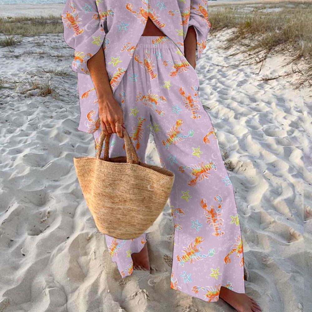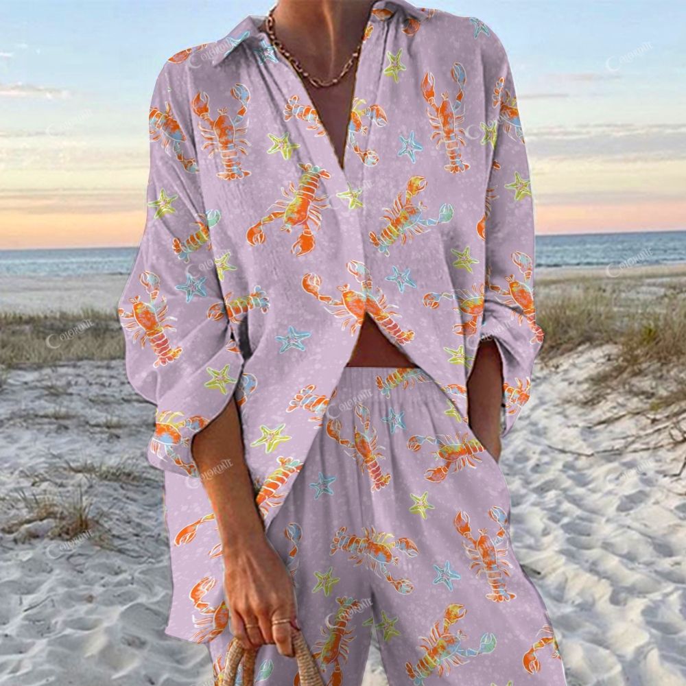 Colordate Women's Red Prawn Printed Shirt & Pants Two-piece Set