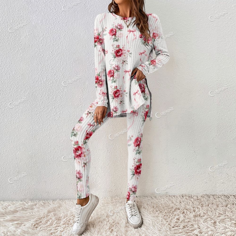Colordate Women's Red Watercolor Flowers And Bow Prints Long Sleeve Suit