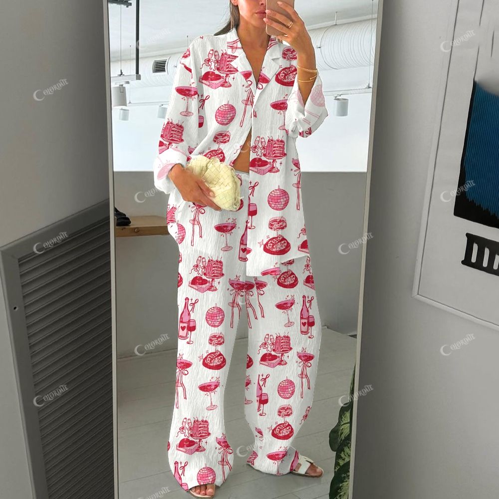 Colordate Women's Wine And Cake Print Cardigan Homewear Set