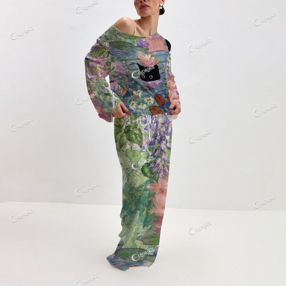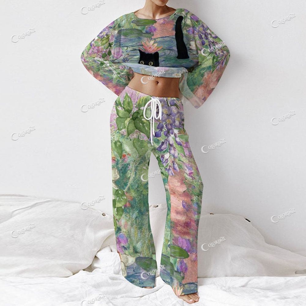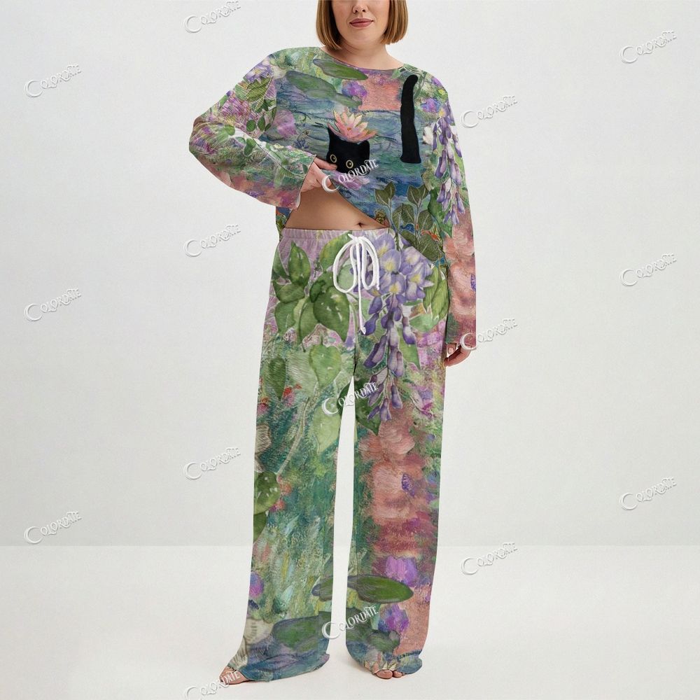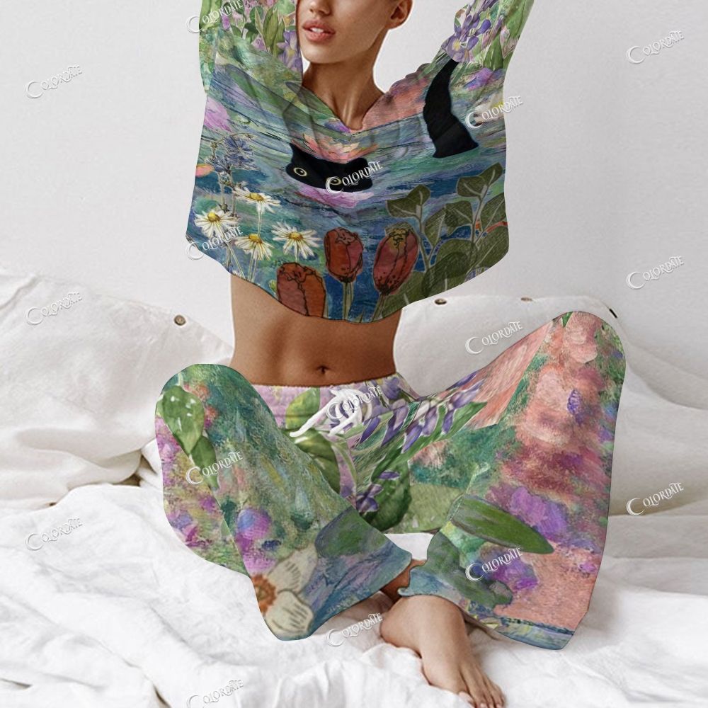 Women's Abstract Impressionist Art & Cat Long Sleeve Cotton Homewear Set