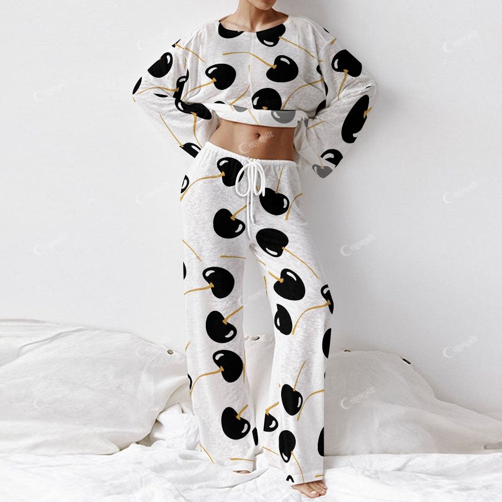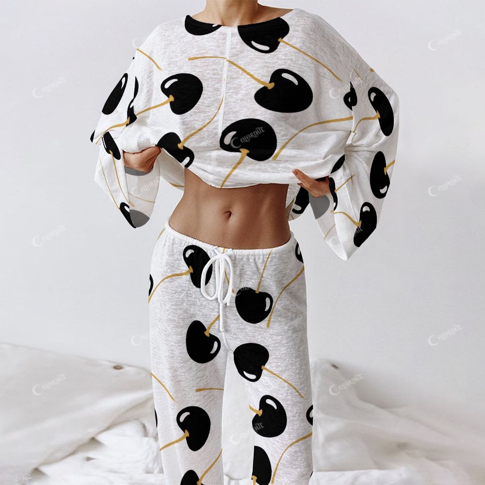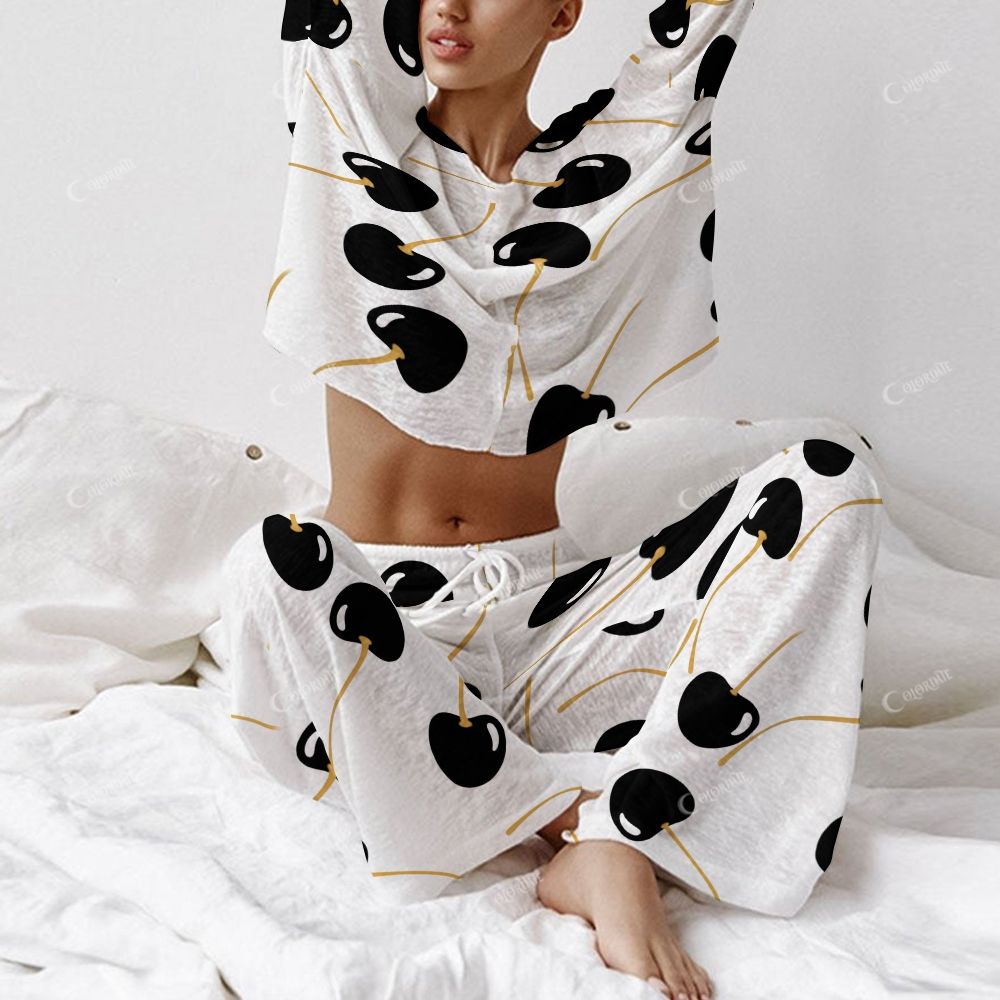 Women's Black Cherry Print Long Sleeve Cotton Homewear Set