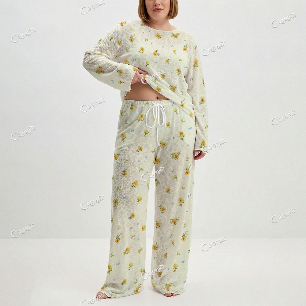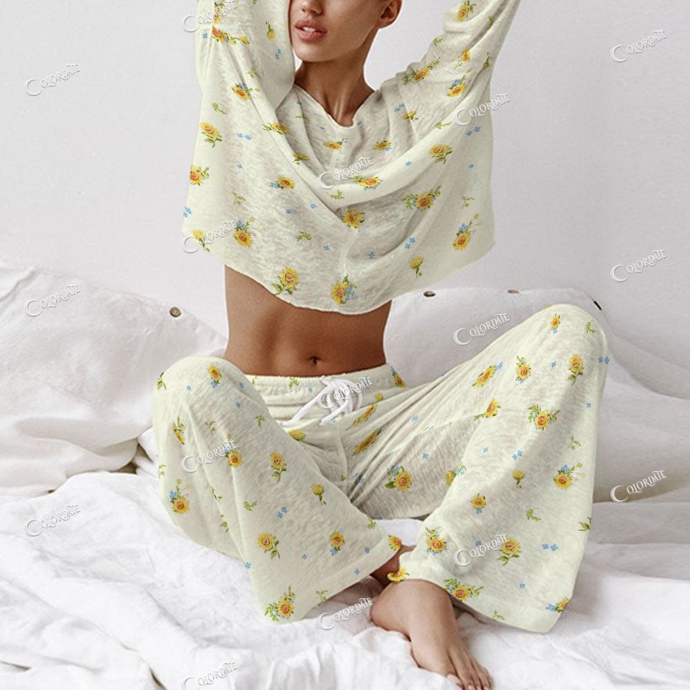 Women's Cute Yellow Flower Print Long Sleeve Cotton Homewear Set