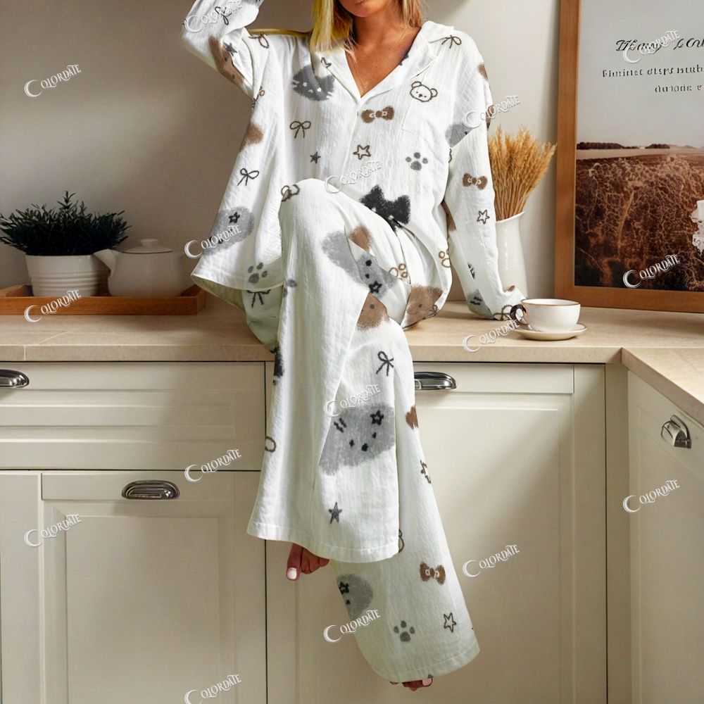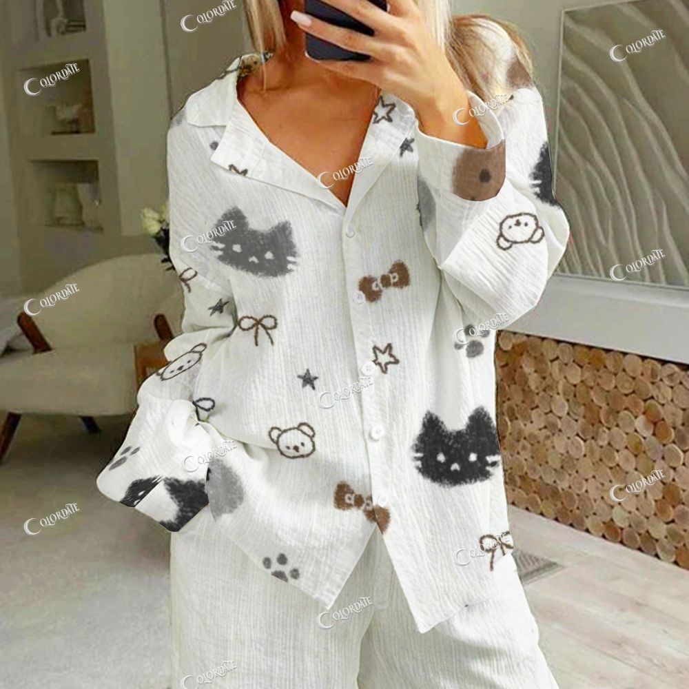 Women's Gray Cat & Bear Print Cotton Cardigan Homewear Set