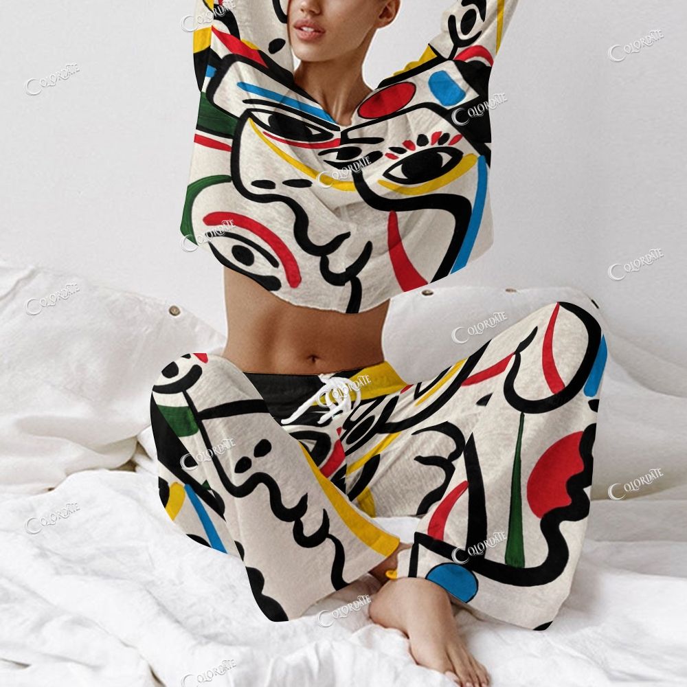 Women's Line Art Face Print Long Sleeve Cotton Homewear Set