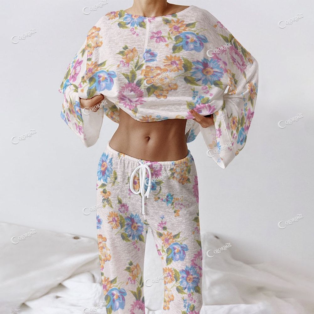 Women's Multi-color Ditsy Floral Cropped Long Sleeve Cotton Homewear Set