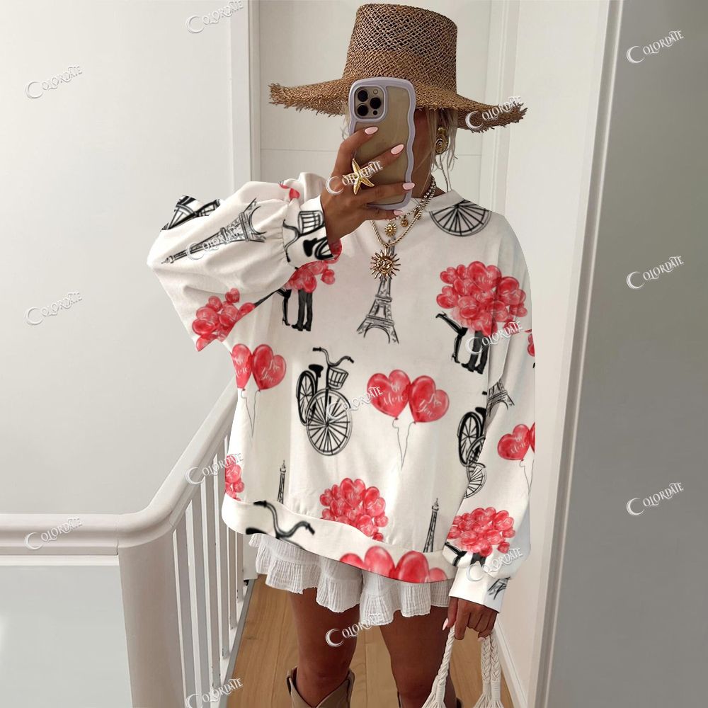 Women's Paris Eiffel Tower & Red Rose Print Casual Crew Neck Sweatshirt