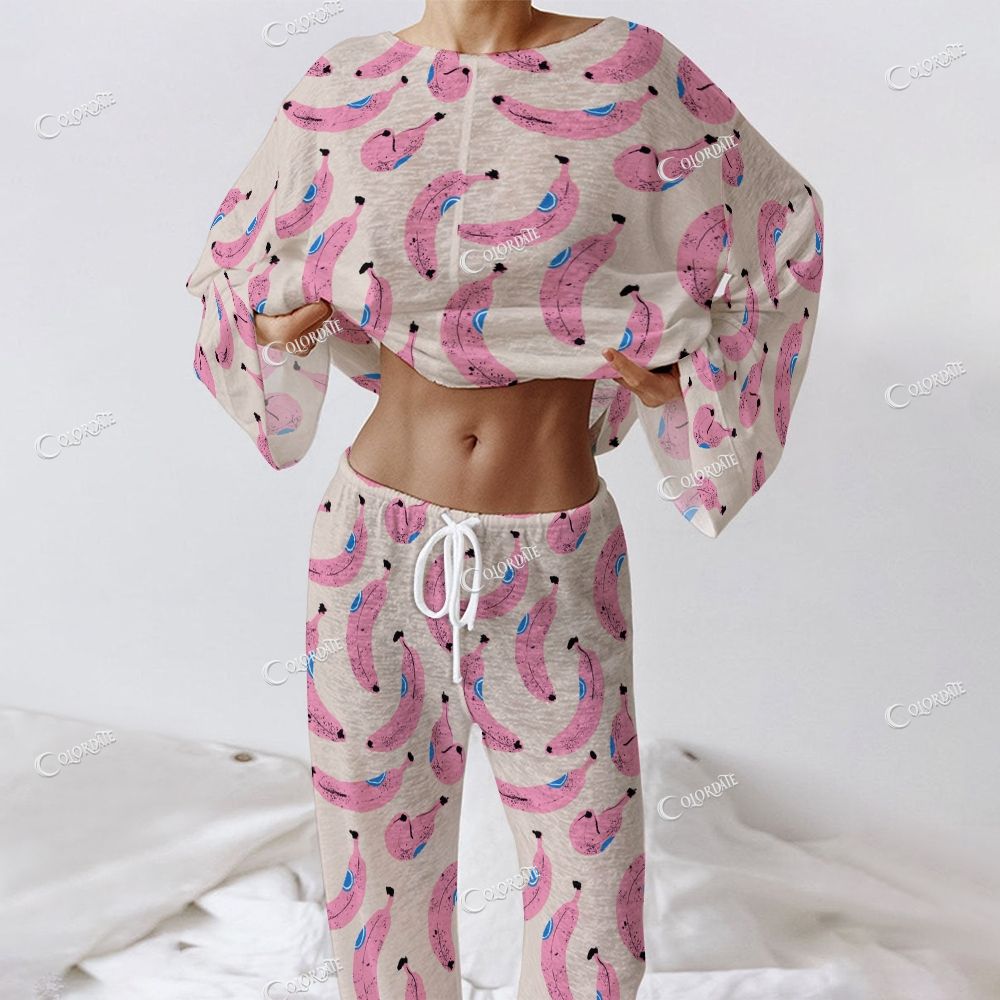 Women's Pink Banana Print Long Sleeve Cotton Homewear Set