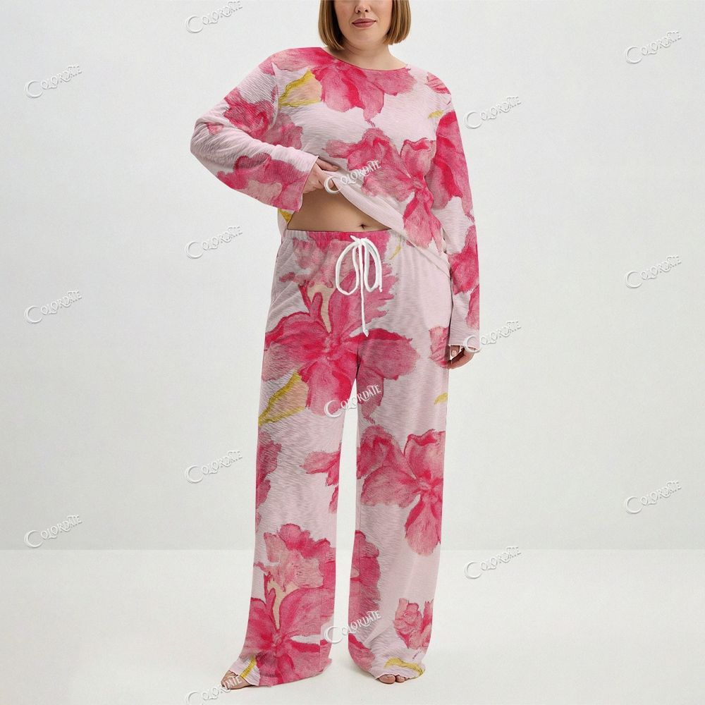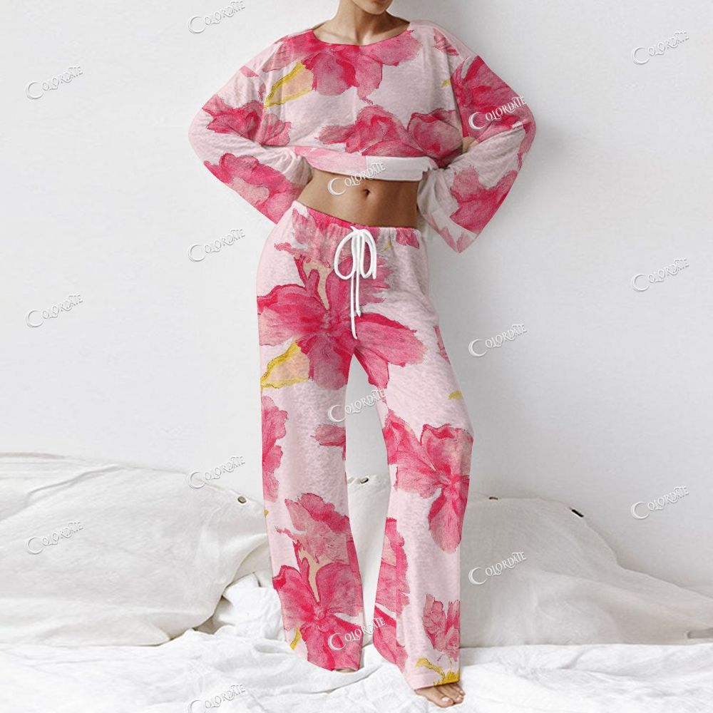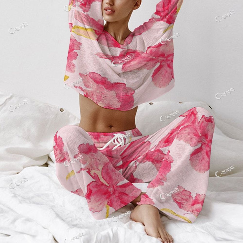 Women's Pink Floral Splash Print Long Sleeve Cotton Homewear Set