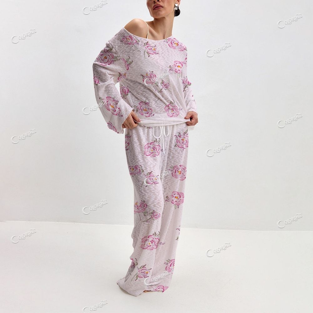 Women's Pink Flower Print Long Sleeve Cotton Homewear Set