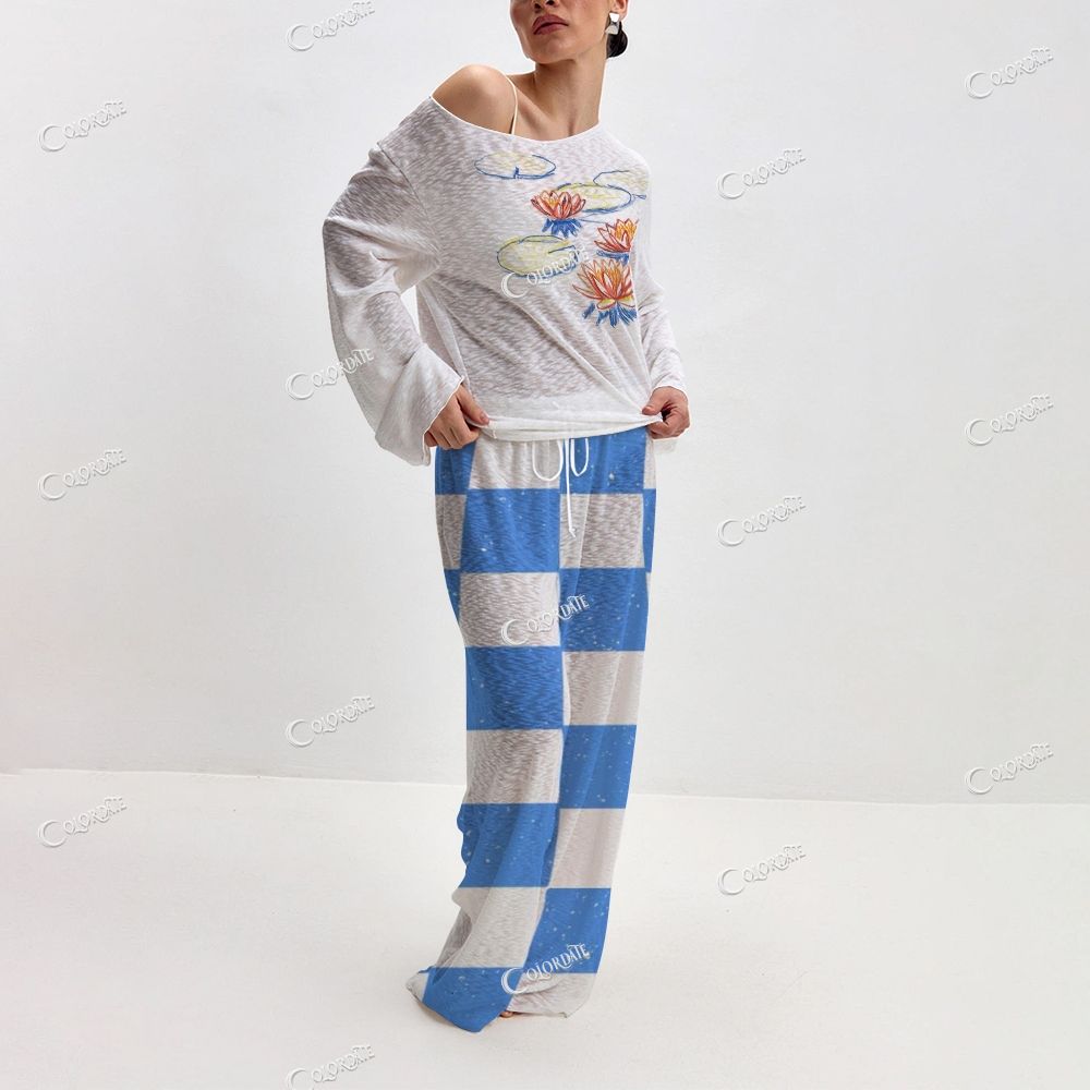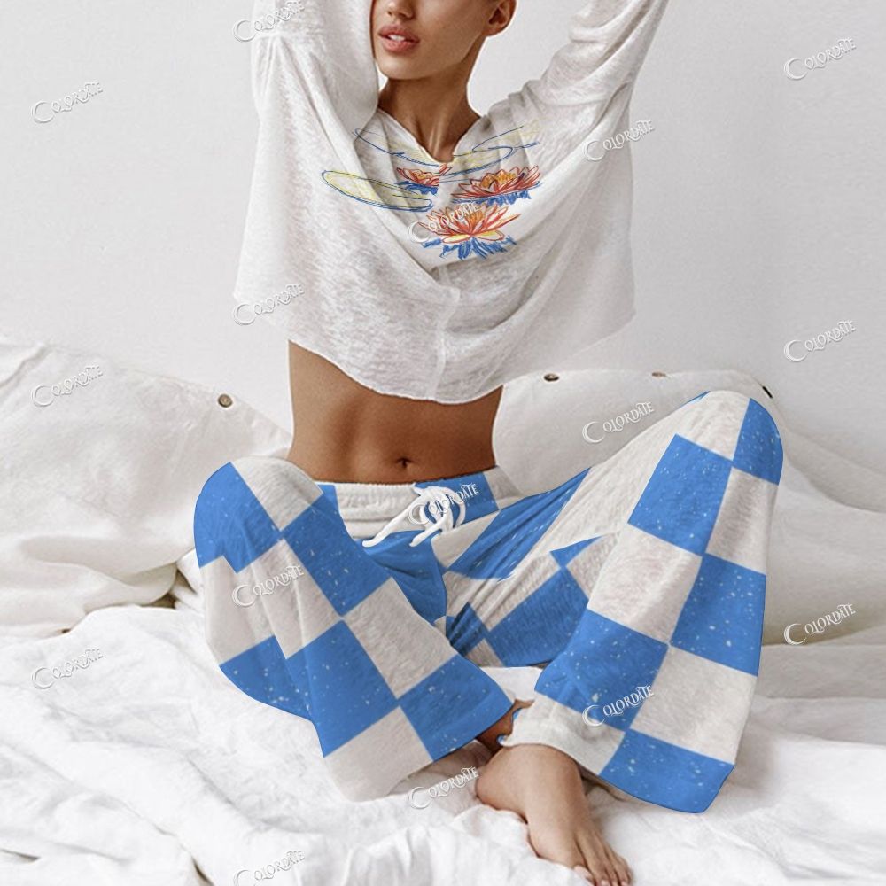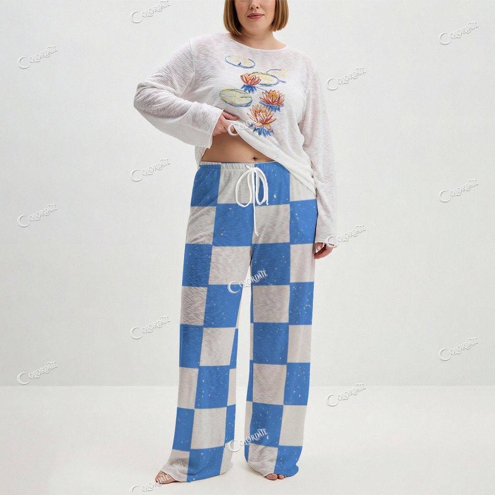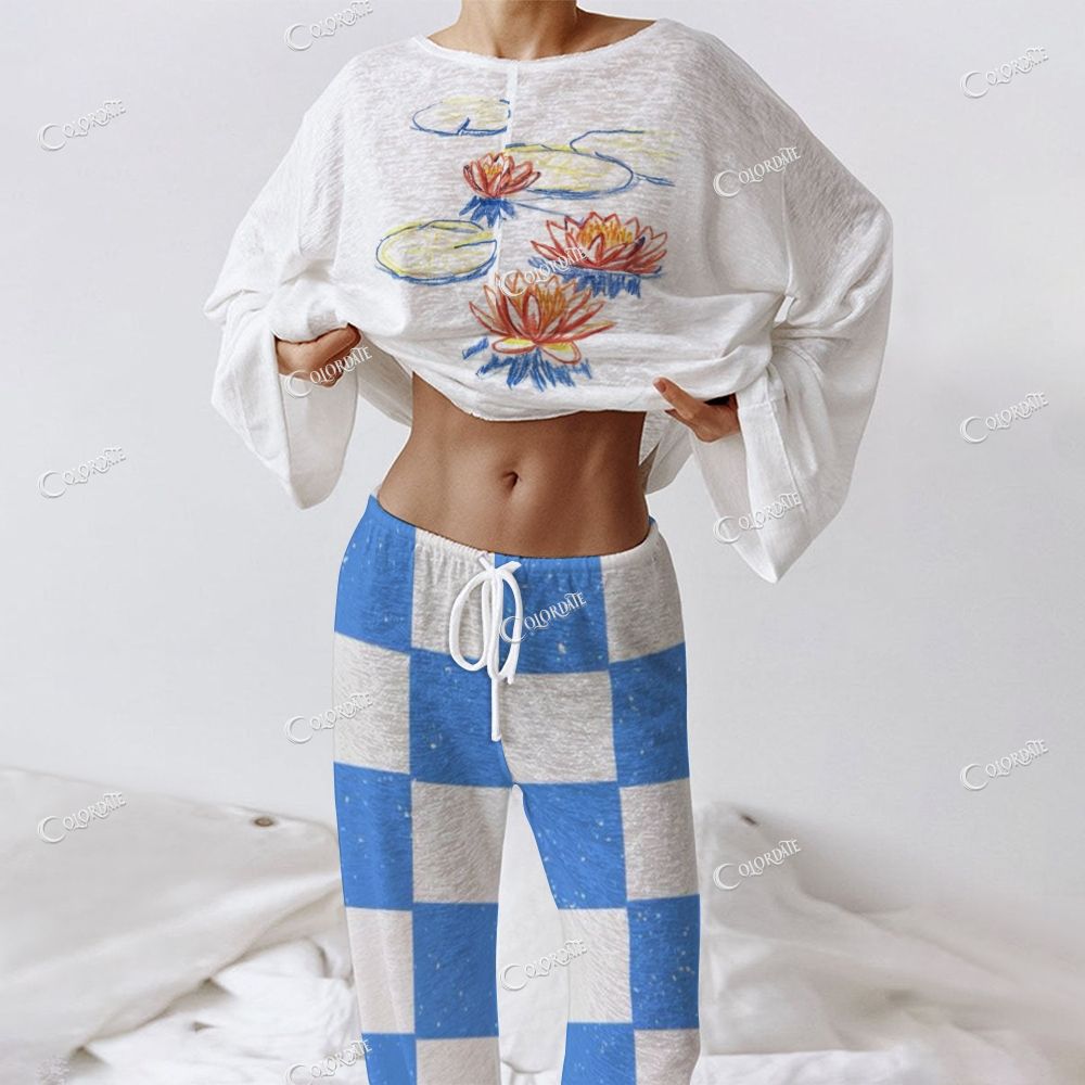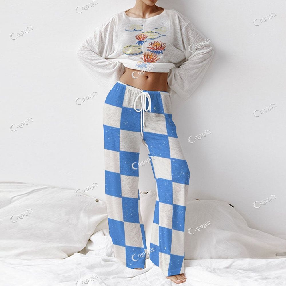 Women's Water Lily Print Checkered Long Sleeve Cotton Homewear Set