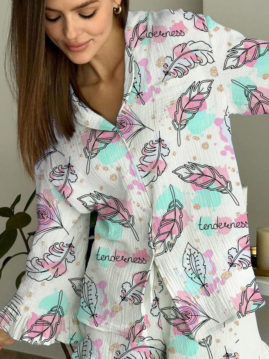 Women's Artistic Feather Printed Long Sleeve Home Suit