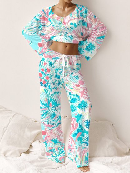 Women's Bohemian Blue Printed Lounge Long Sleeve Suit