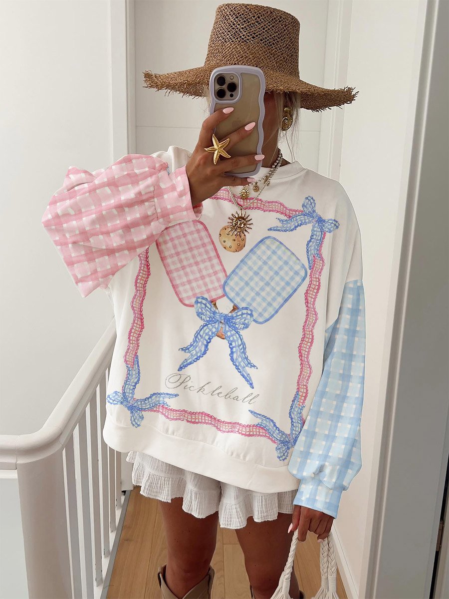 Women's Pink Handball Watercolor Check Print Crew Neck Sweatshirt