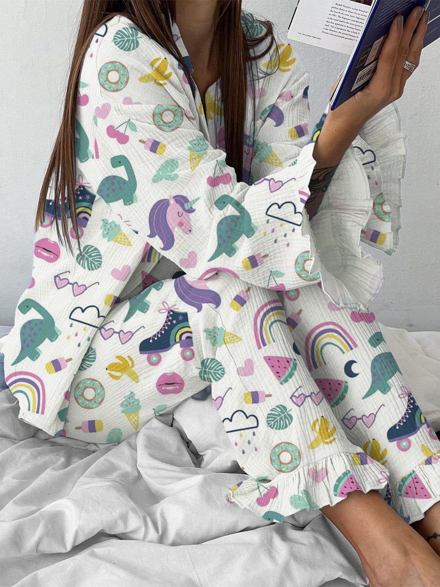 Women's Sport Skate Pattern Ruffle Long Sleeve Pant Set