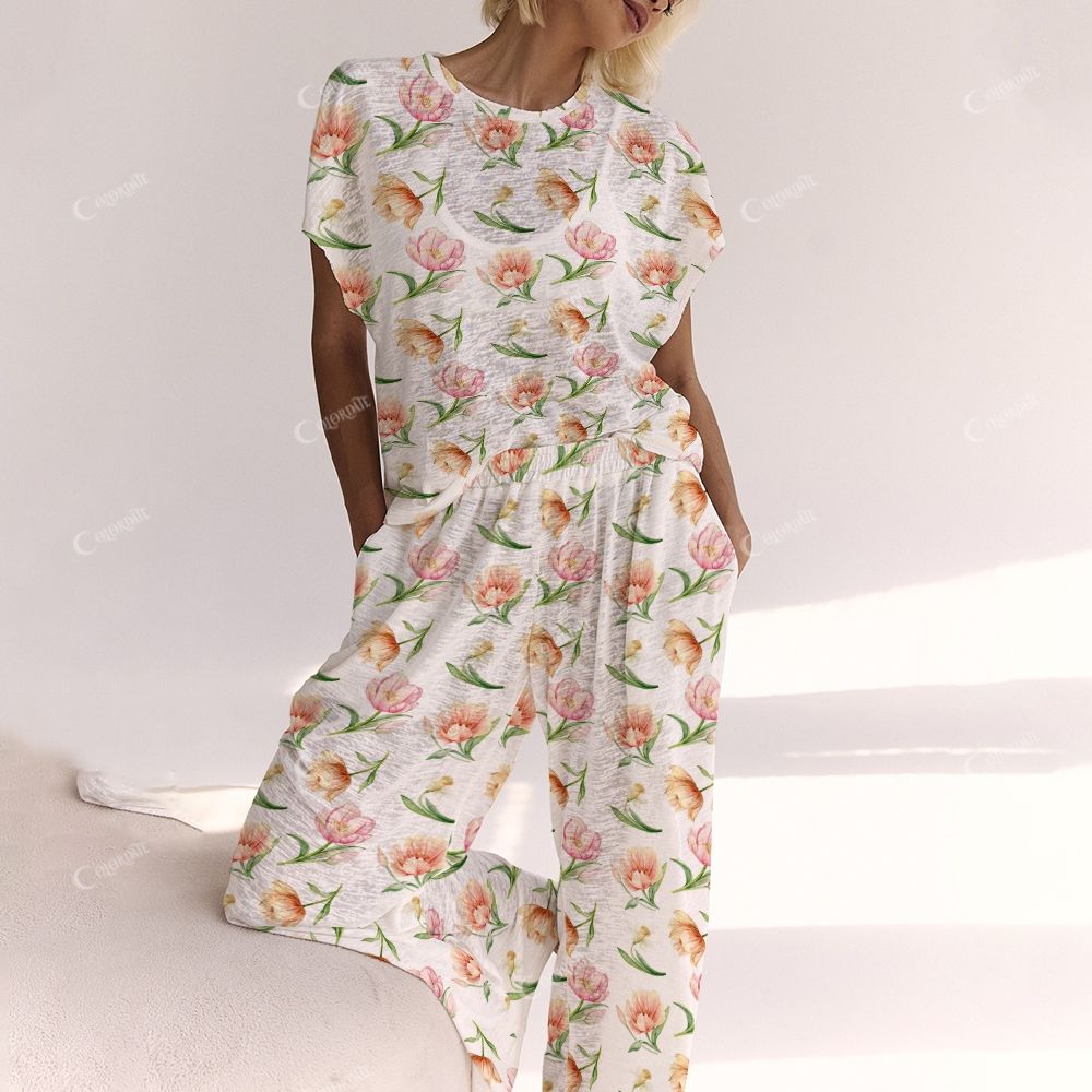 Colordate Pink And Orange Floral Prints Ladies Lounge Suit