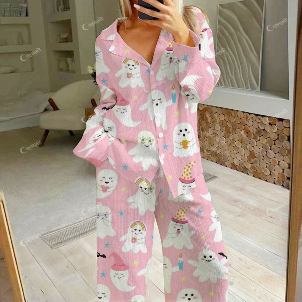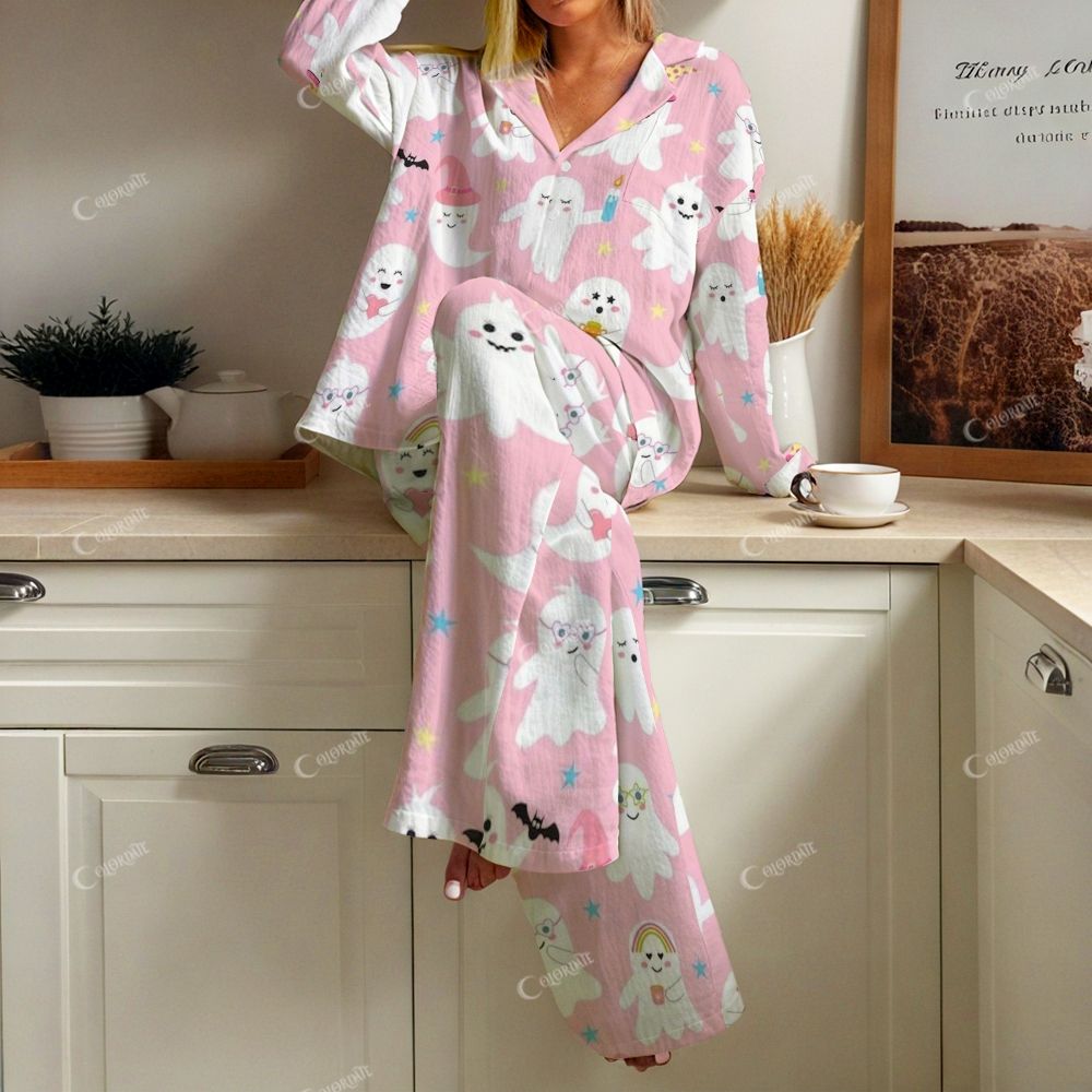 Women's Pink Ghost Print Cotton Cardigan Homewear Set