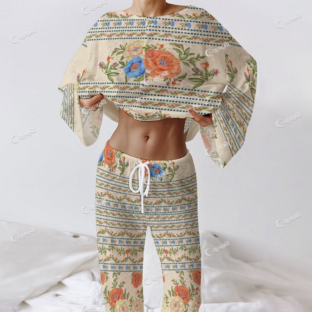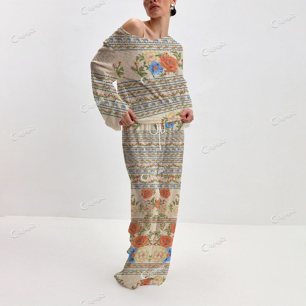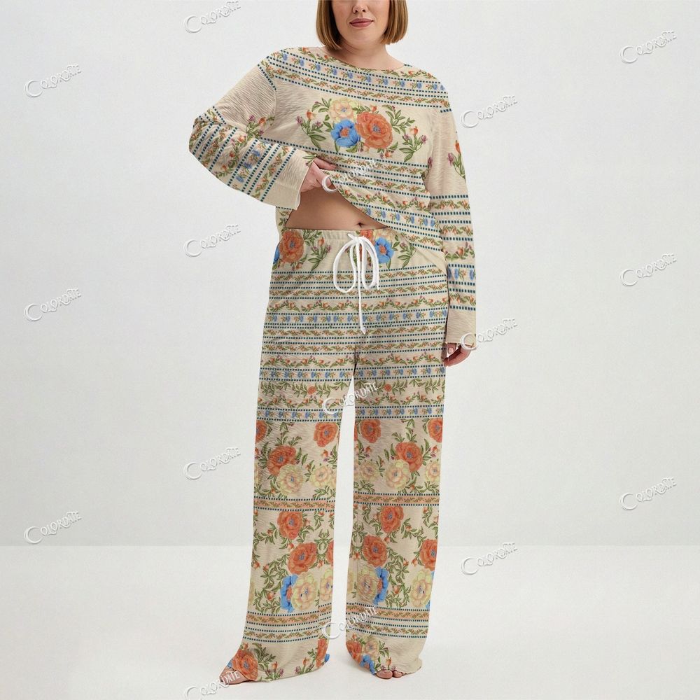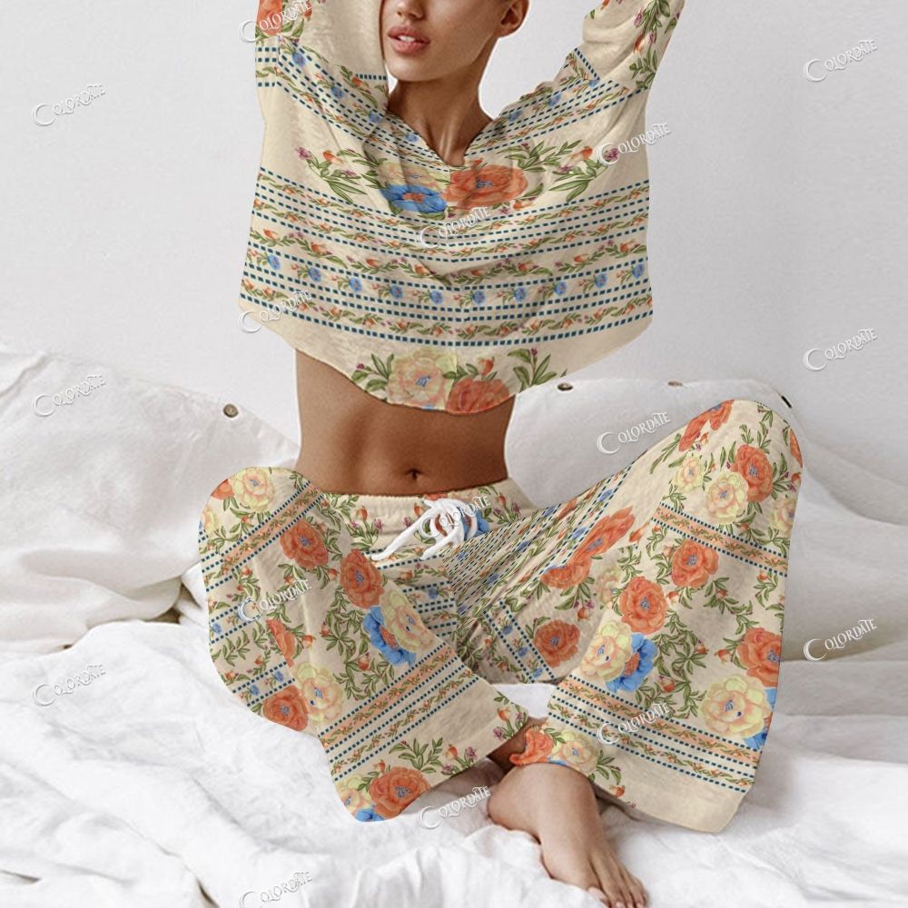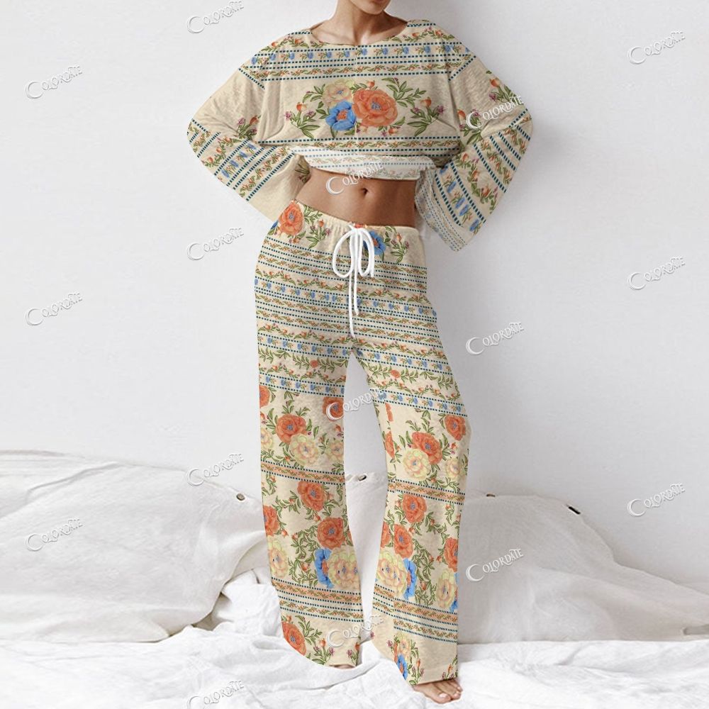 Women's Retro Floral Stripe Print Long Sleeve Cotton Homewear Set