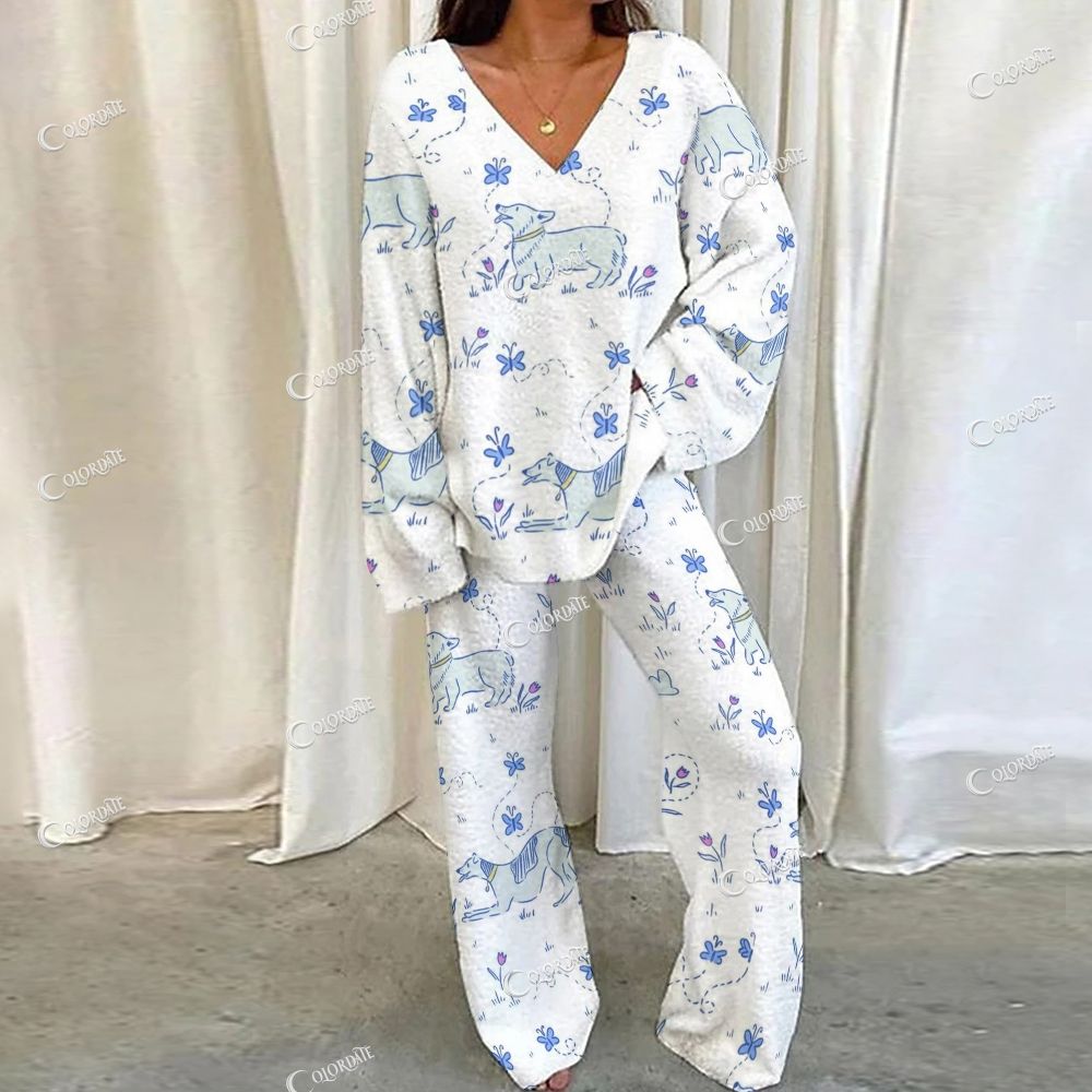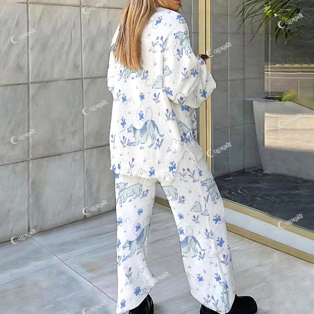 Blue Dog & Floral Sketch Loungewear Set For Women