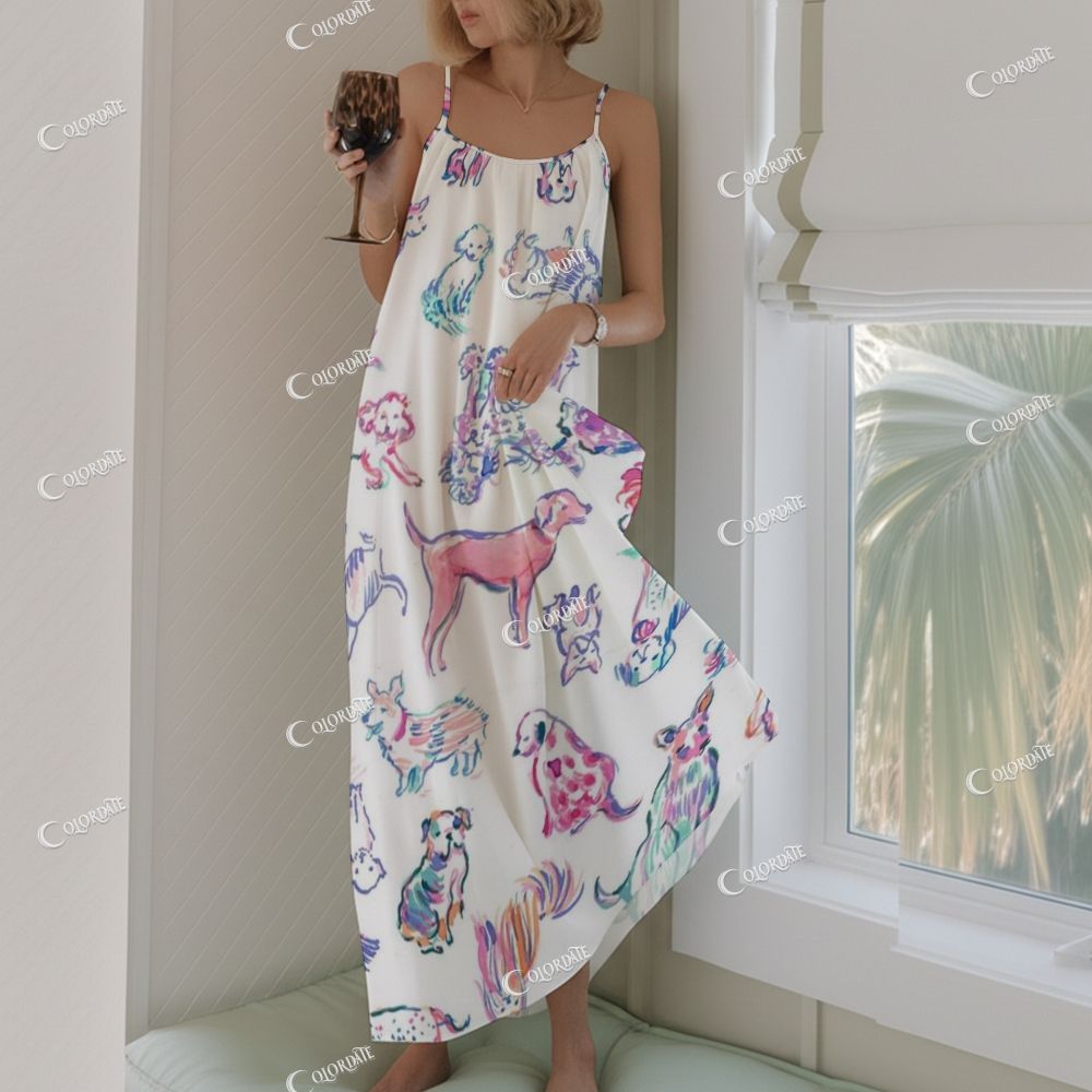 Colorful Dog Sketch Long Neckline Pleated Nightgown