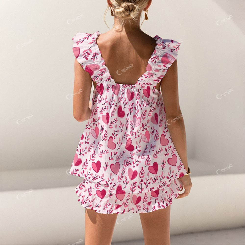 Short Tank Pink Love Heart Plant Pattern Top Shorts Pajama Set