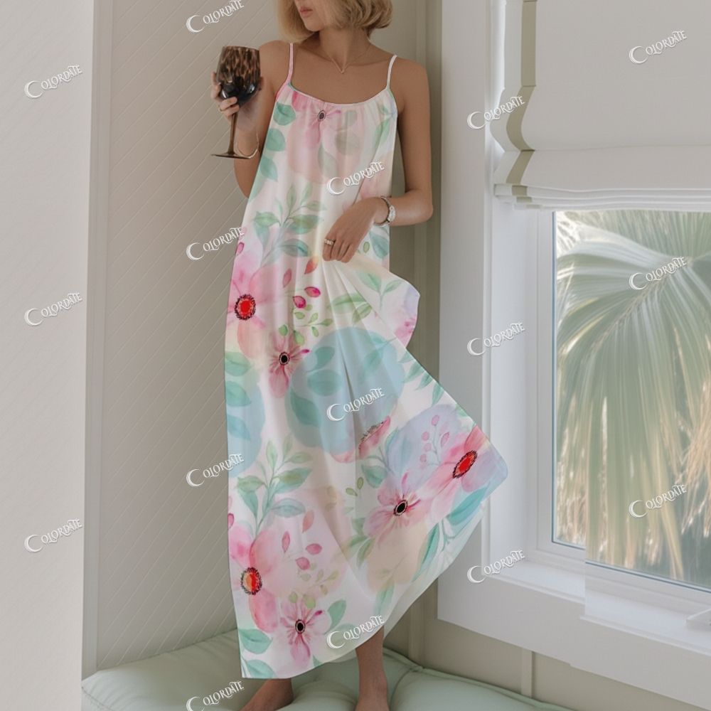 Watercolor Floral Long Neckline Pleated Nightgown