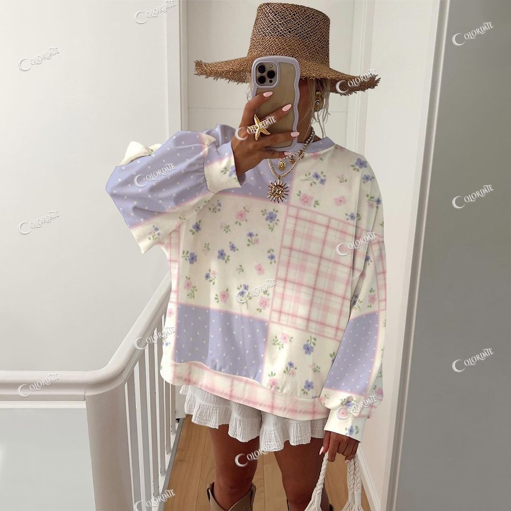 Women's Purple Checkered Pattern Casual Crew Neck Sweatshirt