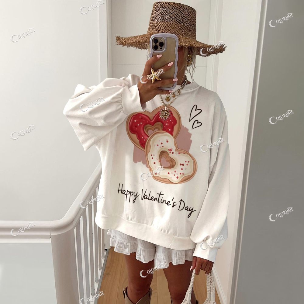 Women's Red Heart-Donut Print Casual Crew Neck Sweatshirt